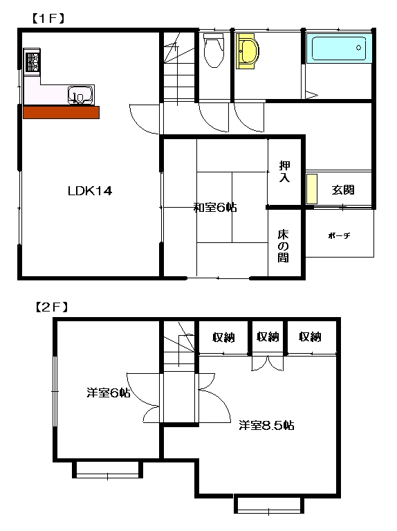 [1F:和室6帖、LDK14 2F:洋室6帖、洋室8.5帖]