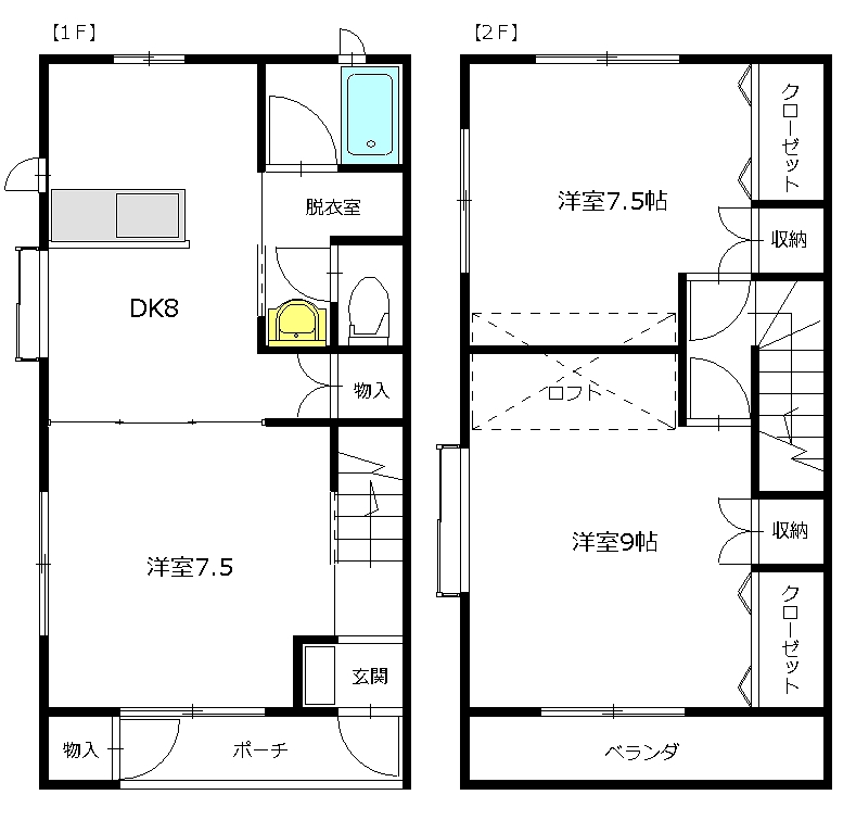 2LDK[1F:洋7.5・DK8 2F:洋7.5・洋9・ロフト]